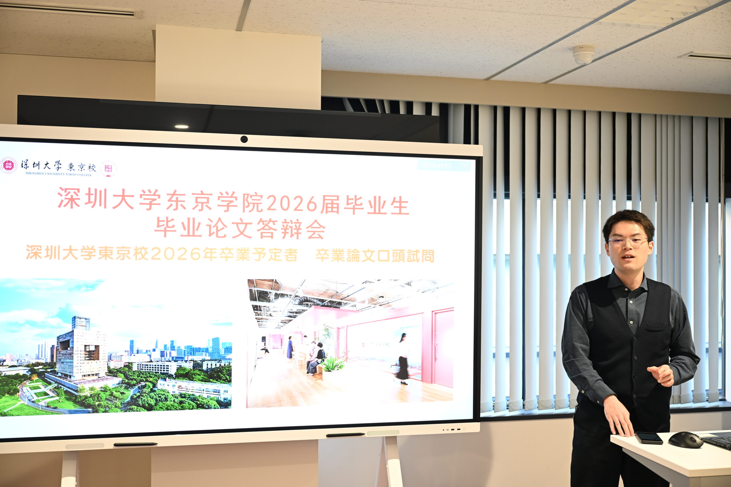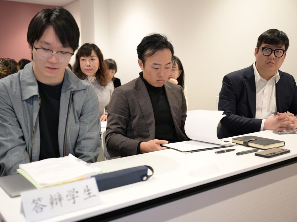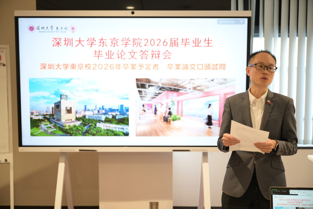 2025年11月20日、深圳大学東京校にて、第1期生による卒業論文試問が行われました。今回の試問は、本校で初めてとなる歴史的な取り組みです。当日は審査委員会として6名の教員が参加し、さらに在校生にも公開する形で実施されました。先輩たちの4年間の学びの成果を間近で見られる貴重な機会となり、会場には緊張感と期待感が広がっていました。