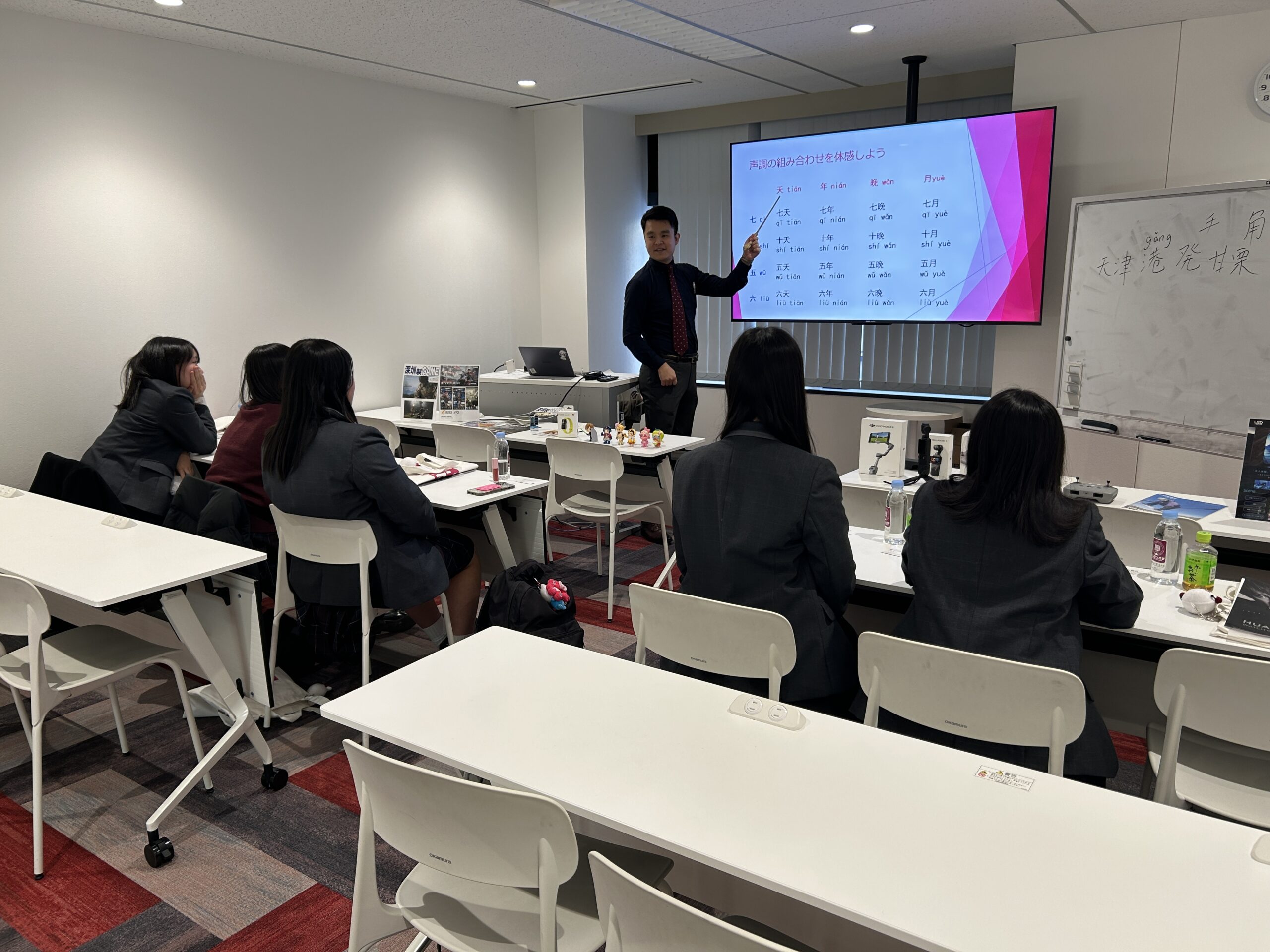 今回が初めて中国語に触れる生徒も多く、発音の練習や簡単なあいさつ表現を中心に、楽しく授業を進めました。最初は少し戸惑いながらも、積極的に声を出して挑戦する姿が印象的でした。教室には笑顔があふれ、中国語を身近に感じてもらえる時間となりました。