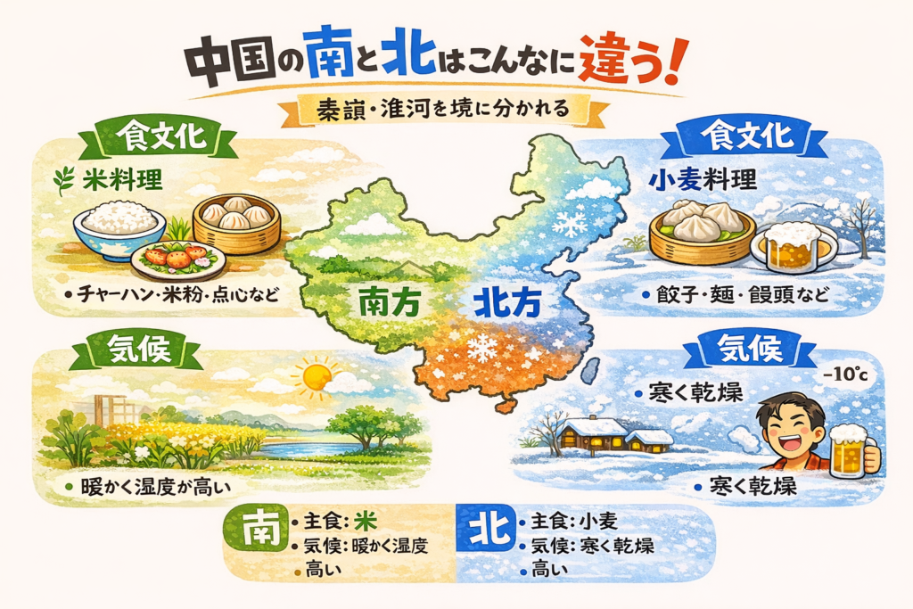 中国は世界でもとても広い国の一つで、面積は日本の約25倍もあります。そのため、同じ中国でも地域によって文化や生活習慣が大きく違います。中国ではよく「南方(南)」と「北方(北)」という言い方をして地域の特徴を説明することがあります。 実は、中...