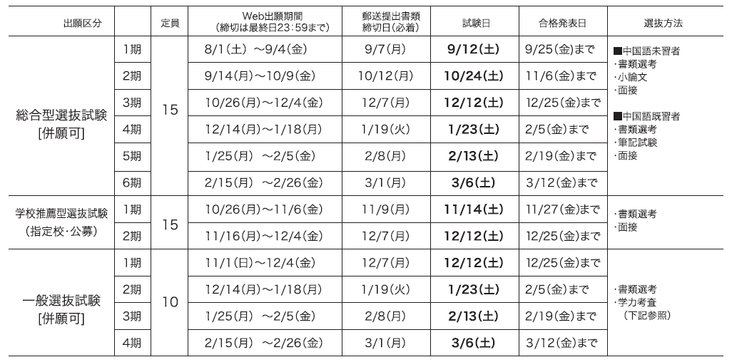| 書類選考、学力考査2教科 | 選択:国語、数学、情報Ⅰ、外国語<選択 英語・中国語> |